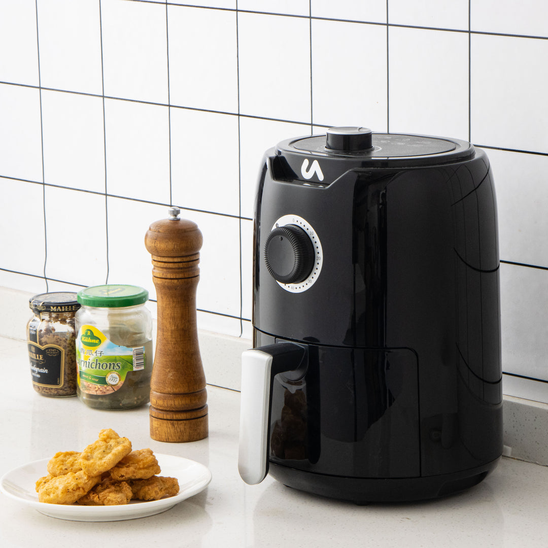 The modern Piano Black look of the Uber Appliance Air Fryer sets it apart from the competition. The user friendly knobs, auto shutoff feature, whisper quiet operation and dishwasher safe 2-Quart basket make it the best air fryer on the market.