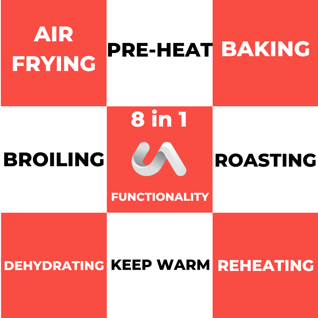 In addition to the manual mode there are 8 cooking preset options for ideal cooking times and temperatures for frying, baking, broiling, roasting, dehydrating, toasting and reheating various meats, vegetables, and desserts.